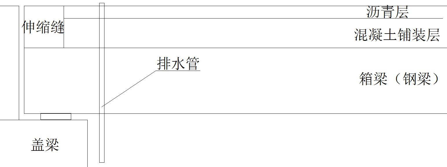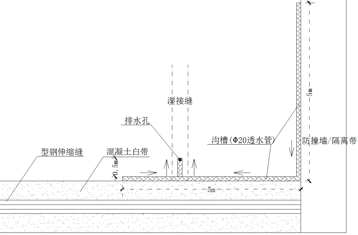 沿着型钢伸缩缝白带和隔离带/防撞墙以及湿接缝开孔穿管位置,在沥青铺装上开一条10cm深、10cm宽的连通沟槽,在沟槽底部设置一根透水管,与湿接缝处的排水管连接,通过湿接缝底部伸出的透水管进行排水。