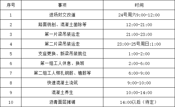 为确保在有限时间内完成换梁及桥面铺装翻建及沥青加罩施工,各个工序的施工时间及工序的衔接时间控制尤为关键。为此施工前我们对施工工序进行了详细推演,并确定了各个工序的开始和结束时间,同时留有机动时间,时间精确到小时。