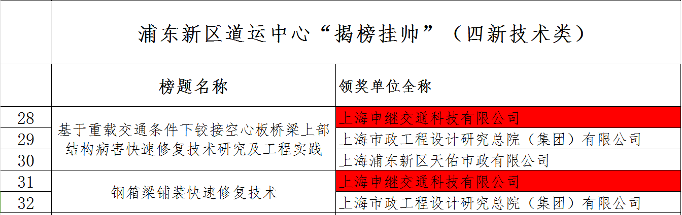 2024年11月22日,从“2024年浦东新区道路运输行业科技大会”传来喜讯,浦东新区道路运输事业发展中心举办的“揭榜挂帅”活动获奖名单揭晓,申继交通在此项活动中斩获佳绩,其中“基于重载交通条件下铰接空心板梁上部结构病害快速修复技术”和“钢箱梁铺装快速修复技术”两方案均获得“四新技术类”创意奖。